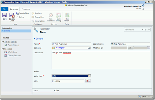 Since some years, I’m using two custom entities to store some parameters used in JavaScript, Plugins and Custom Workflow Activities. As I have been asked to share them with the community, I’m doing it today? I have created a managed solution that contains these two entities: Parameters Category : Used to define parameters groups Category : This is the main entity that stores the parameter with the following attributes: Name : This is a display name that can be changed anytime Logical name : This is a name editable only during creation Category : To indicate in which group of parameters the parameter belongs Description : no need of explanation here Value type : define the type of value Value : depending of the type, the appropriate control is displayed. When saving the value is also copied to a global text attribute named “global value” This way, I can store typed parameters for multiple usages: Storing counter current value Storing url of an external applicati...