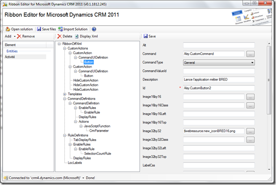 Ribbons… such a beautiful new feature of Dynamics CRM 2011 but so hard to manage. We all know how to add a button to an existing group but doing more is complex due to all ribbon components, rules and actions available… So, I’ll try to help you by releasing a new tool: the ribbon editor. This is not a wizard, you still need to know how a ribbon behaves but you shouldn’t need to learn all ribbon possibilities anymore… I help you… I now need your help! There are so many possibilities that I can’t test and validate every ribbon possibilities. That’s the reason of the “alpha” release. So please try this tool and provide feedback on codeplex. The more people try this tool the more bug will be identified and corrected! The codeplex page where you can find the tool is located here : http://ribboneditor.codeplex.com