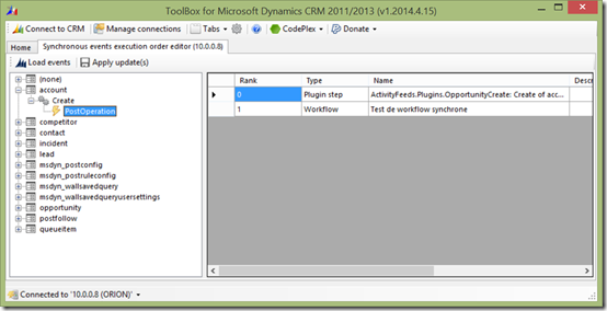 Last week, I receive a request from Rob Boyers that was asking for a tool that can help him to order execution order of synchronous events, plugin steps and workflows. Indeed, in Dynamics CRM 2013, you can set the “rank” property of a plugin step to define its execution order among other steps in the same message and stage, using the PluginRegistrationTool. Unfortunately, there is no such way to edit the “rank” property of a synchronous workflow in a UI. So, here is the “Synchronous events execution order editor”, a new XrmToolBox plugin It works only with CRM 2013 and loads all synchronous plugin steps and workflows and group them by Entity, Message and Stage. When selecting a stage, you can see all events registered and you can update the rank value. Then, just click on the button “Apply update(s)” to update events on the organization. Just a note: for synchronous workflows that are activated, they will be deactivated, updated then activated back. As usual, the XrmToolBox and i...